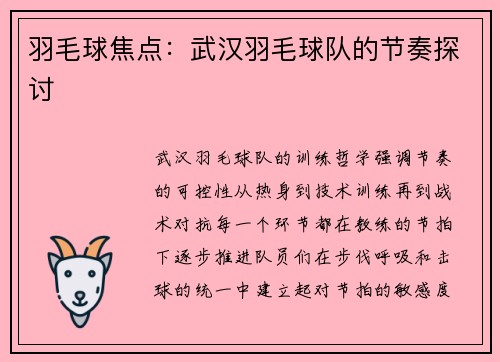在现代网球比赛中,单打的个人能力固然重要,但整体战术体系的构建往往是决定胜负的关键。武汉网球队近年来在国内外赛场上崭露头角,其成功的核心秘诀之一便是独具特色的整体压制体系。所谓“整体压制”,不仅仅是单纯依靠力量或速度,而是一种通过团队协作、战术布置和心理施压,让对手在场上难以发挥自如的高效打法。 武汉网球队的整体压制体系,首先强调“前场控制与后场协作”的双重策略。在发球环节,球队选手通过精确的发球...
